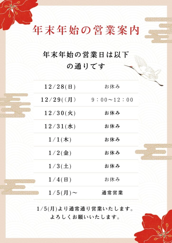 年末は12/29(月)の午前中まで、年始は1/5(月)からです。